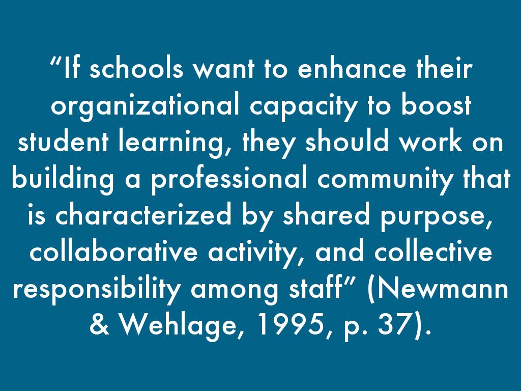 “If schools want to enhance their organizational capacity to boost student learning, they should work on building a professional community that is characterized by shared purpose, collaborative activity, and collective responsibility among staff” (Newmann & Wehlage, 1995, p. 37).