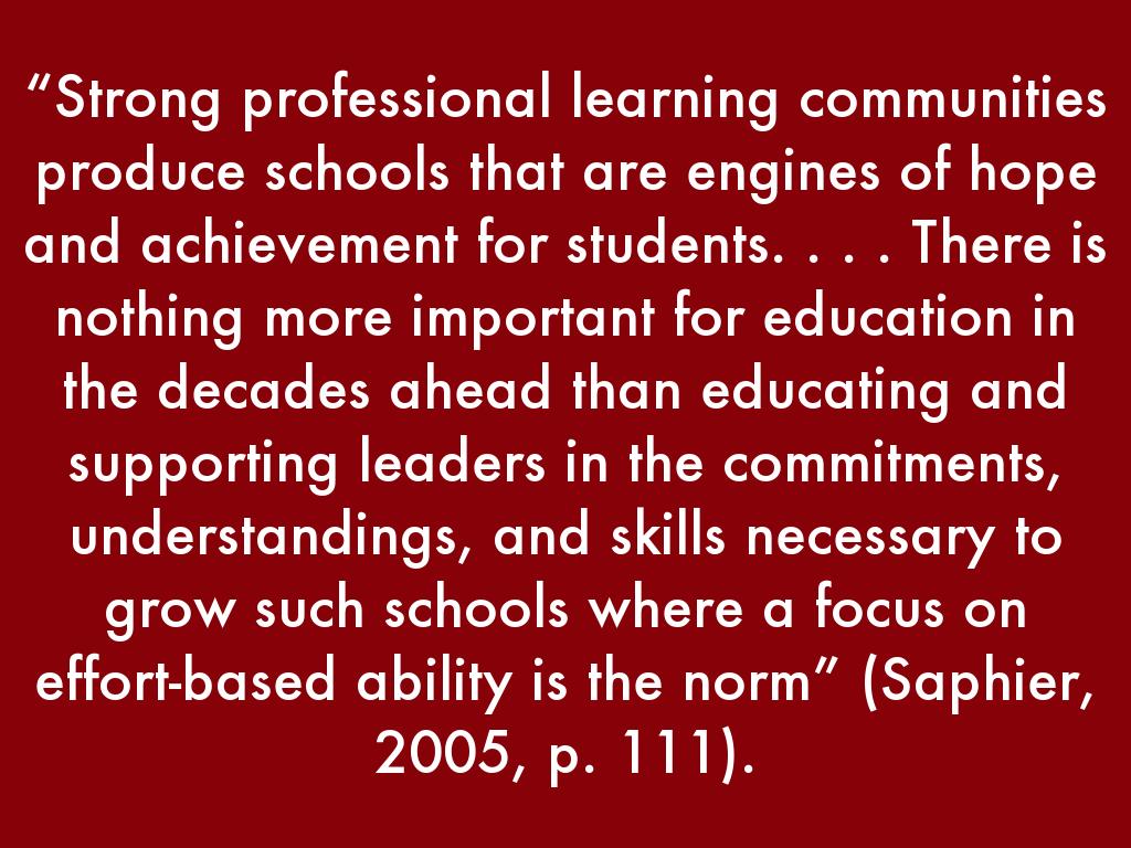 “Strong professional learning communities produce schools that are engines of hope and achievement for students. . . . There is nothing more important for education in the decades ahead than educating and supporting leaders in the commitments, understandings, and skills necessary to grow such schools where a focus on effort-based ability is the norm” (Saphier, 2005, p. 111).