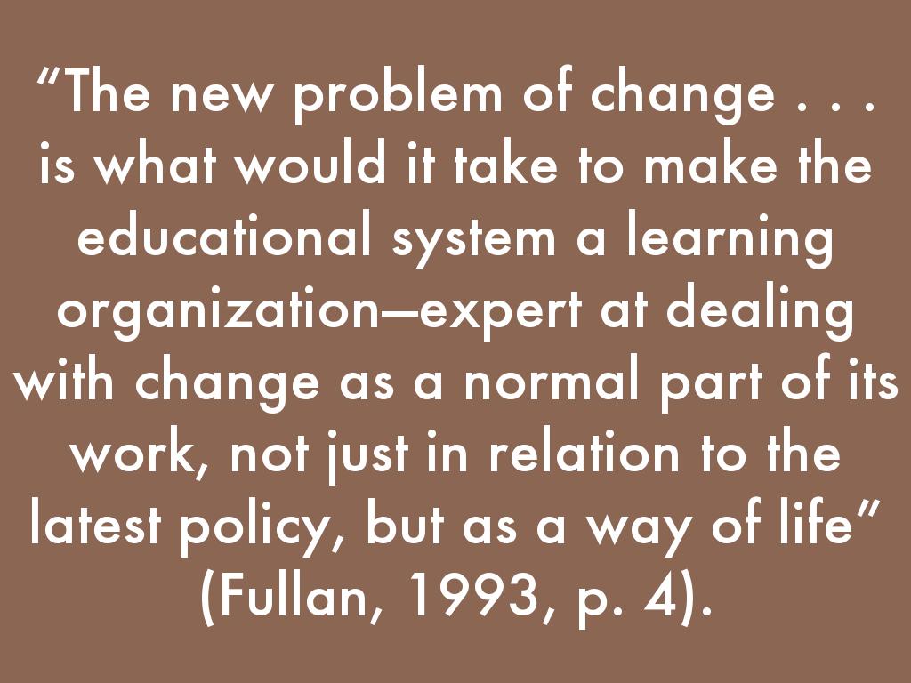 “The new problem of change . . . is what would it take to make the educational system a learning organization—expert at dealing with change as a normal part of its work, not just in relation to the latest policy, but as a way of life” (Fullan, 1993, p. 4).