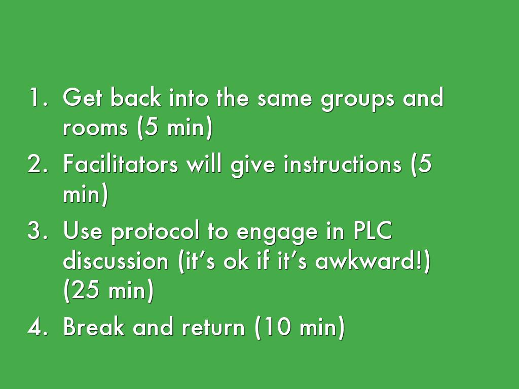 • Use protocol to engage in PLC discussion (it’s ok if it’s awkward!) (25 min)
