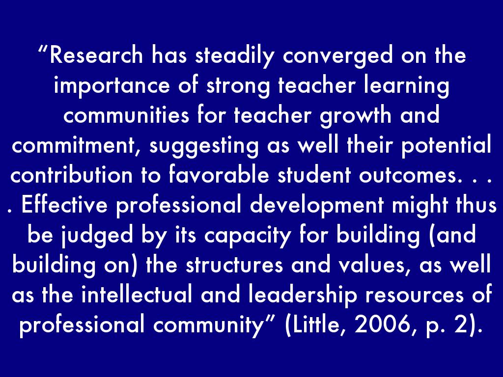 “Research has steadily converged on the importance of strong teacher learning communities for teacher growth and commitment, suggesting as well their potential contribution to favorable student outcomes. . . . Effective professional development might thus be judged by its capacity for building (and building on) the structures and values, as well as the intellectual and leadership resources of professional community” (Little, 2006, p. 2).