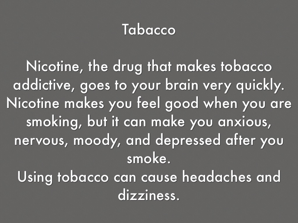 Nicotine, the drug that makes tobacco addictive, goes to your brain very quickly.
