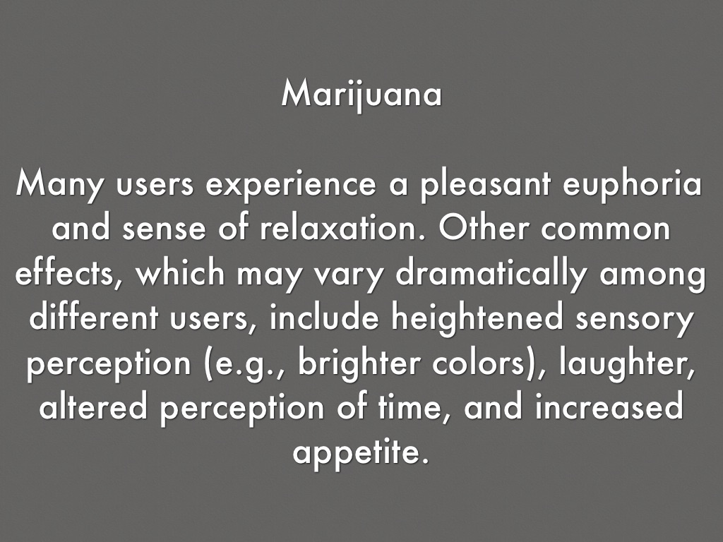 Many users experience a pleasant euphoria and sense of relaxation. Other common effects, which may vary dramatically among different users, include heightened sensory perception (e.g., brighter colors), laughter, altered perception of time, and increased appetite.