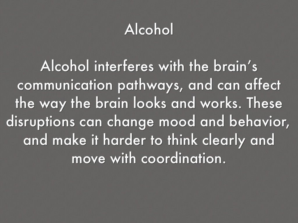 Alcohol interferes with the brain’s communication pathways, and can affect the way the brain looks and works. These disruptions can change mood and behavior, and make it harder to think clearly and move with coordination.