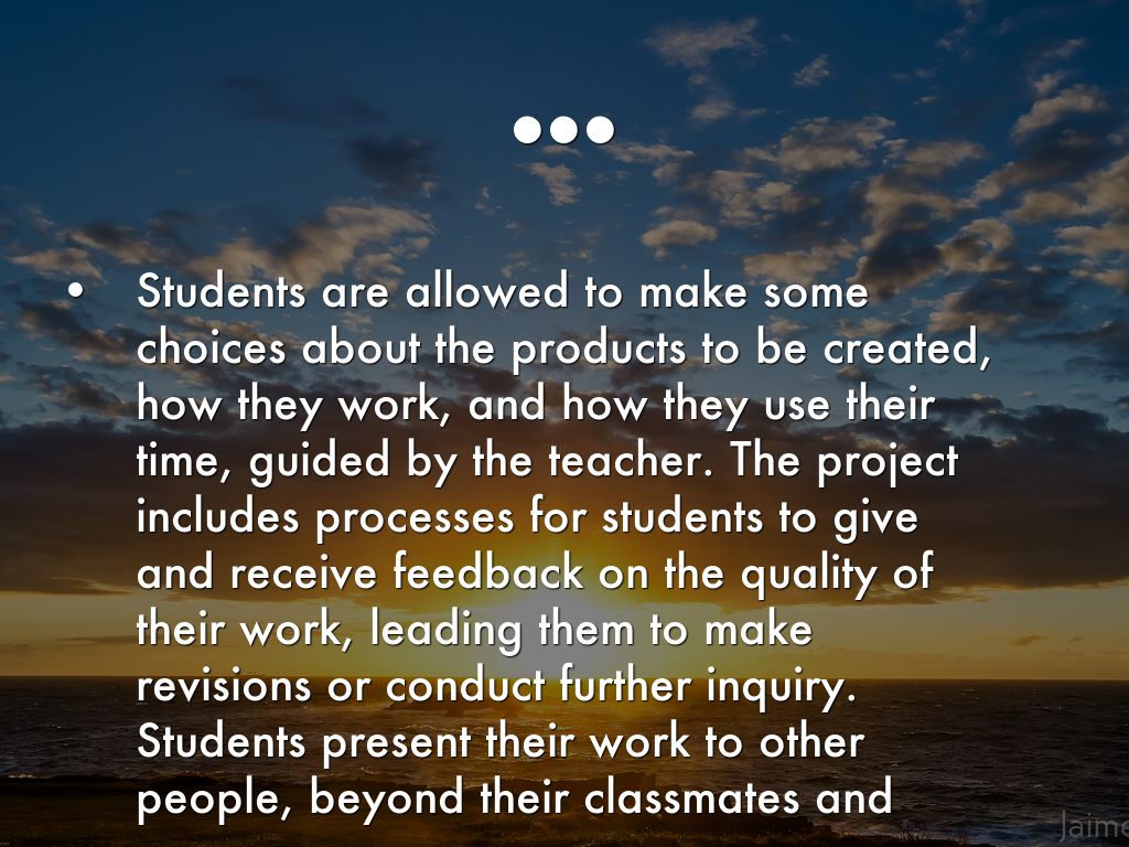 Students are allowed to make some choices about the products to be created, how they work, and how they use their time, guided by the teacher. The project includes processes for students to give and receive feedback on the quality of their work, leading them to make revisions or conduct further inquiry.