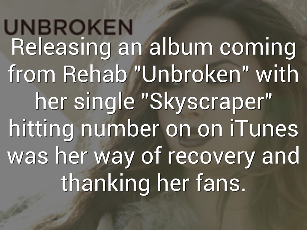 Releasing an album coming from Rehab "Unbroken" with her single "Skyscraper" hitting number on on iTunes was her way of recovery and thanking her fans.