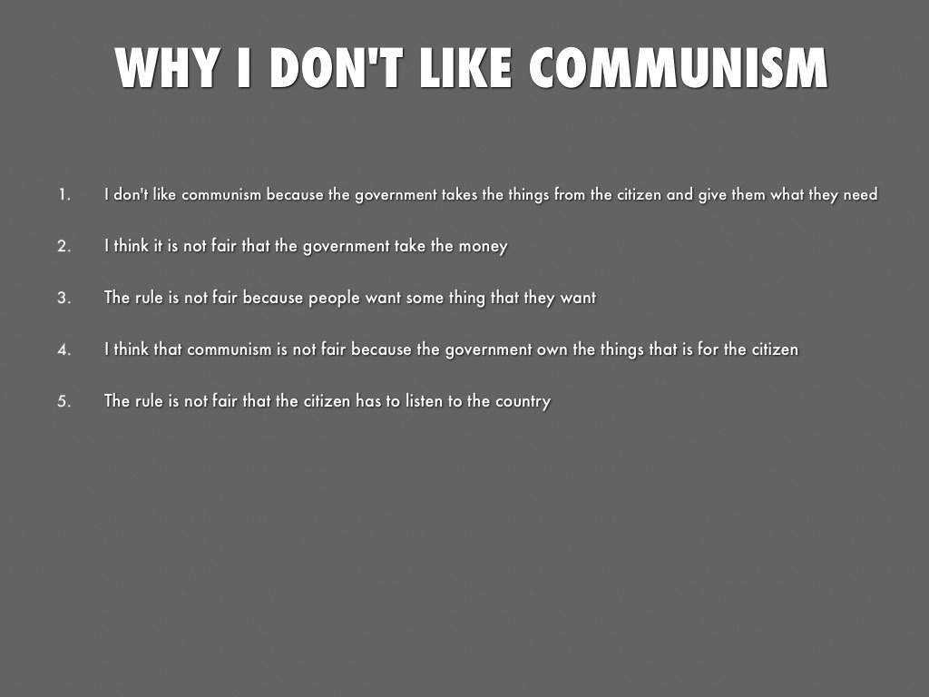 I don't like communism because the government takes the things from the citizen and give them what they need