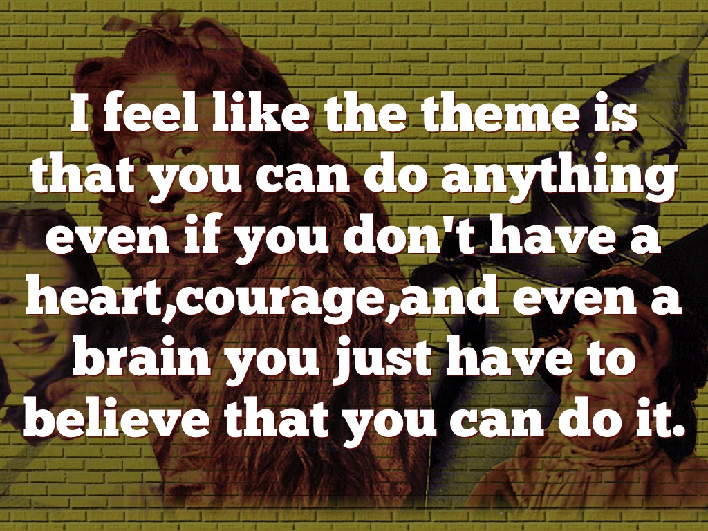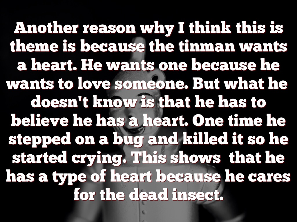 Another reason why I think this is theme is because the tinman wants a heart. He wants one because he wants to love someone. But what he doesn't know is that he has to believe he has a heart. One time he stepped on a bug and killed it so he started crying. This shows that he has a type of heart because he cares for the dead insect.