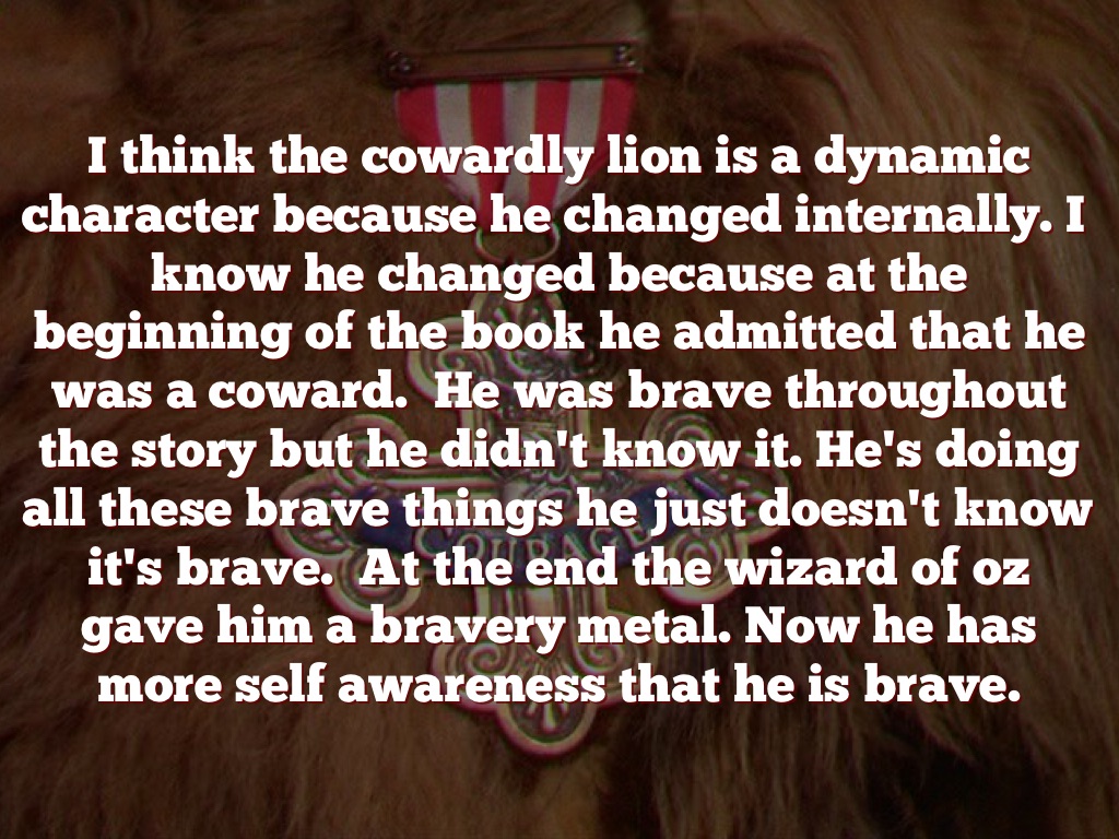 I think the cowardly lion is a dynamic character because he changed internally. I know he changed because at the beginning of the book he admitted that he was a coward. He was brave throughout the story but he didn't know it. He's doing all these brave things he just doesn't know it's brave. At the end the wizard of oz gave him a bravery metal. Now he has more self awareness that he is brave.