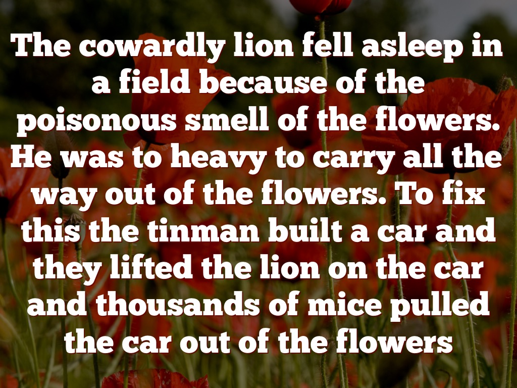 The cowardly lion fell asleep in a field because of the poisonous smell of the flowers. He was to heavy to carry all the way out of the flowers. To fix this the tinman built a car and they lifted the lion on the car and thousands of mice pulled the car out of the flowers