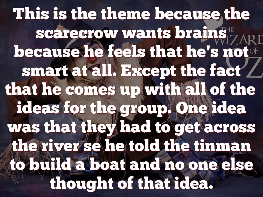 This is the theme because the scarecrow wants brains because he feels that he's not smart at all. Except the fact that he comes up with all of the ideas for the group. One idea was that they had to get across the river se he told the tinman to build a boat and no one else thought of that idea.