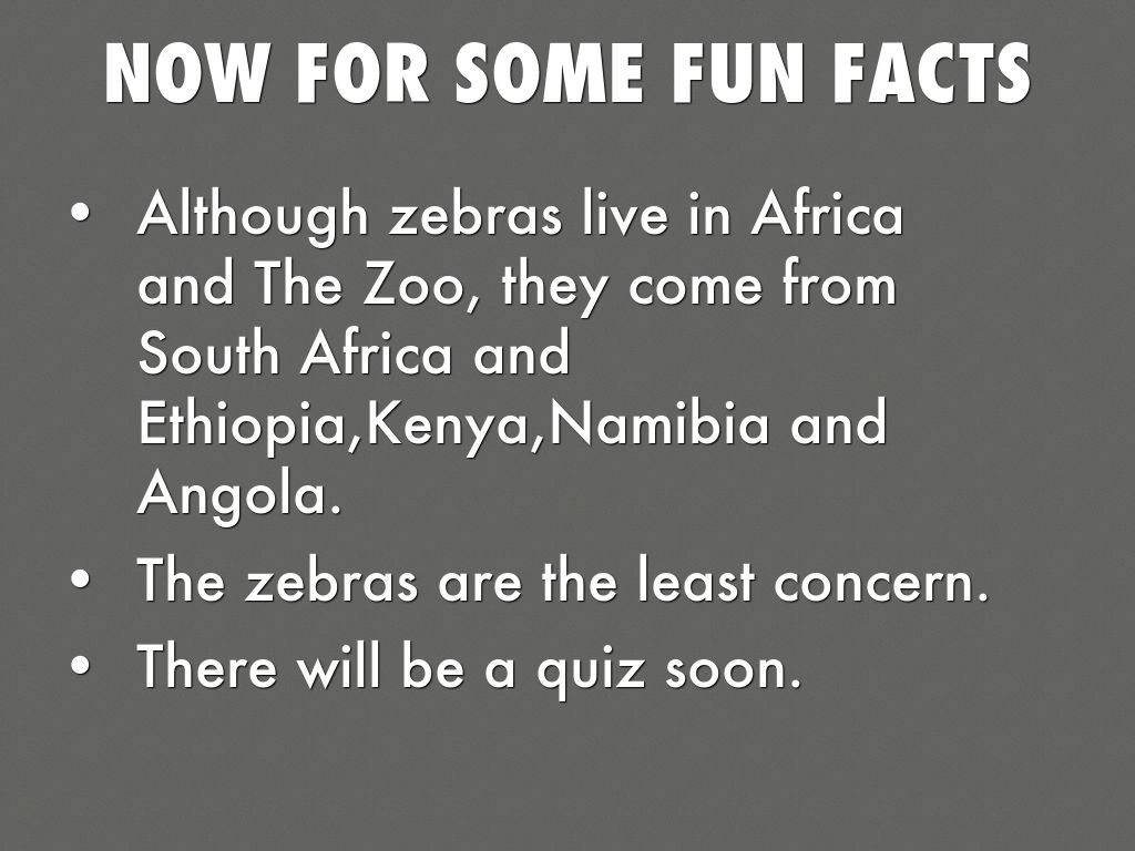 Although zebras live in Africa and The Zoo, they come from South Africa and Ethiopia,Kenya,Namibia and Angola.
