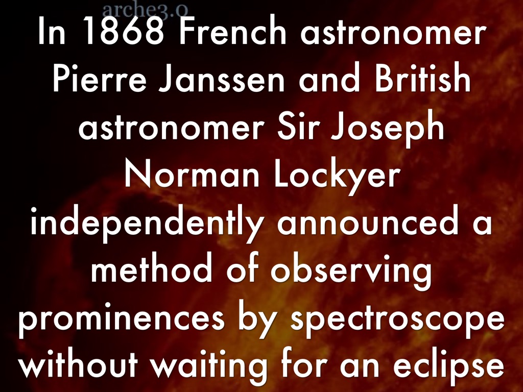 In 1868 French astronomer Pierre Janssen and British astronomer Sir Joseph Norman Lockyer independently announced a method of observing prominences by spectroscope without waiting for an eclipse