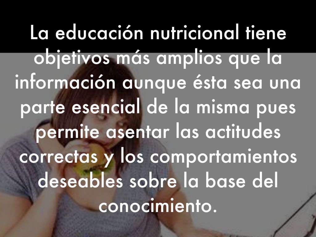 La educación nutricional tiene objetivos más amplios que la información aunque ésta sea una parte esencial de la misma pues permite asentar las actitudes correctas y los comportamientos deseables sobre la base del conocimiento.