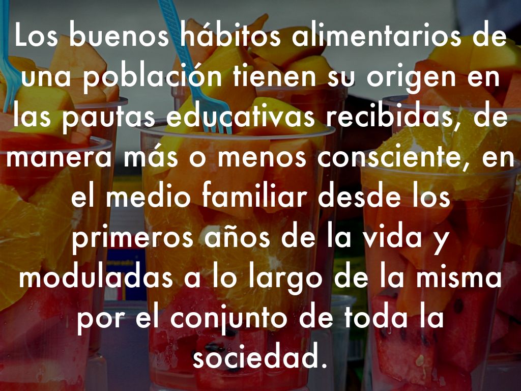 Los buenos hábitos alimentarios de una población tienen su origen en las pautas educativas recibidas, de manera más o menos consciente, en el medio familiar desde los primeros años de la vida y moduladas a lo largo de la misma por el conjunto de toda la sociedad.