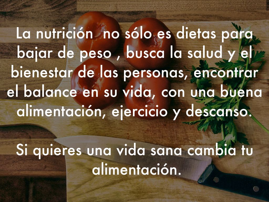 La nutrición no sólo es dietas para bajar de peso , busca la salud y el bienestar de las personas, encontrar el balance en su vida, con una buena alimentación, ejercicio y descanso.