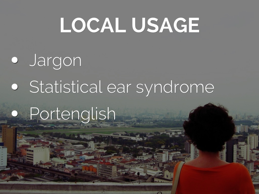 Local jargon : English words that have become part of the Portuguese language and therefore taken on a secondary pronunciation that is "correct" in the local context but wrong in the global one Corporate Purchase Ultimate Apple