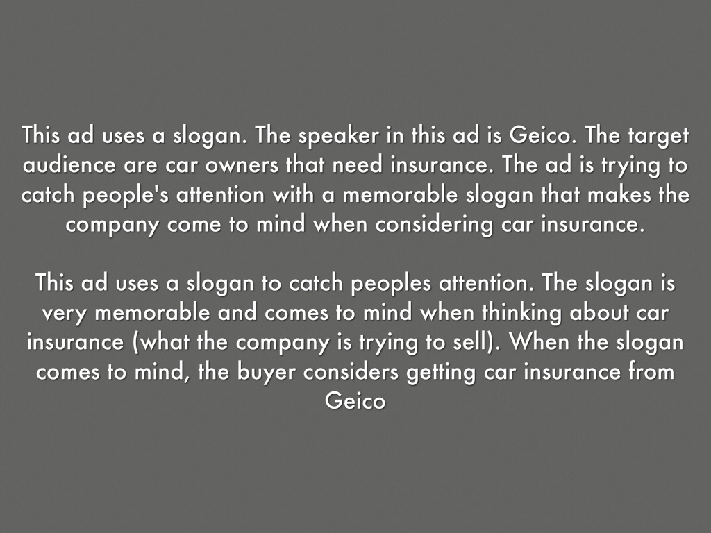This ad uses a slogan to catch peoples attention. The slogan is very memorable and comes to mind when thinking about car insurance (what the company is trying to sell). When the slogan comes to mind, the buyer considers getting car insurance from Geico