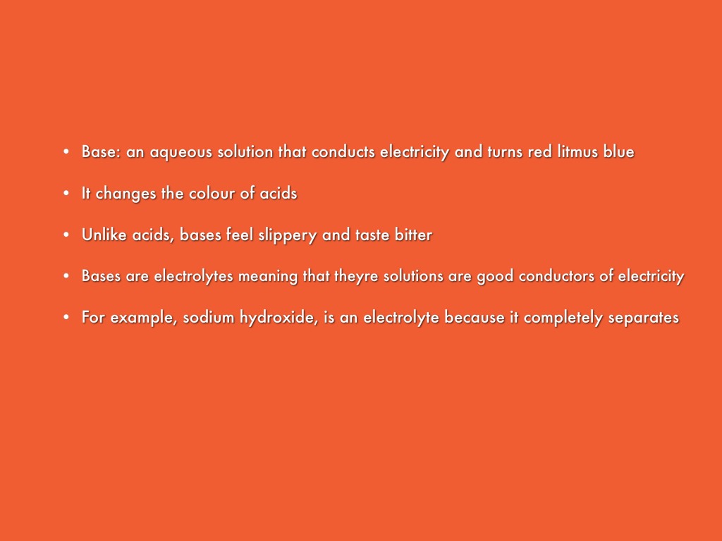 Base: an aqueous solution that conducts electricity and turns red litmus blue