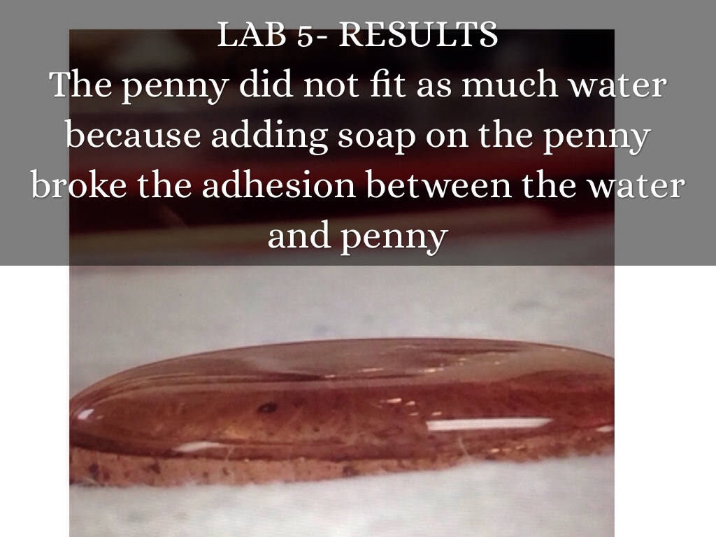 The penny did not fit as much water because adding soap on the penny broke the adhesion between the water and penny