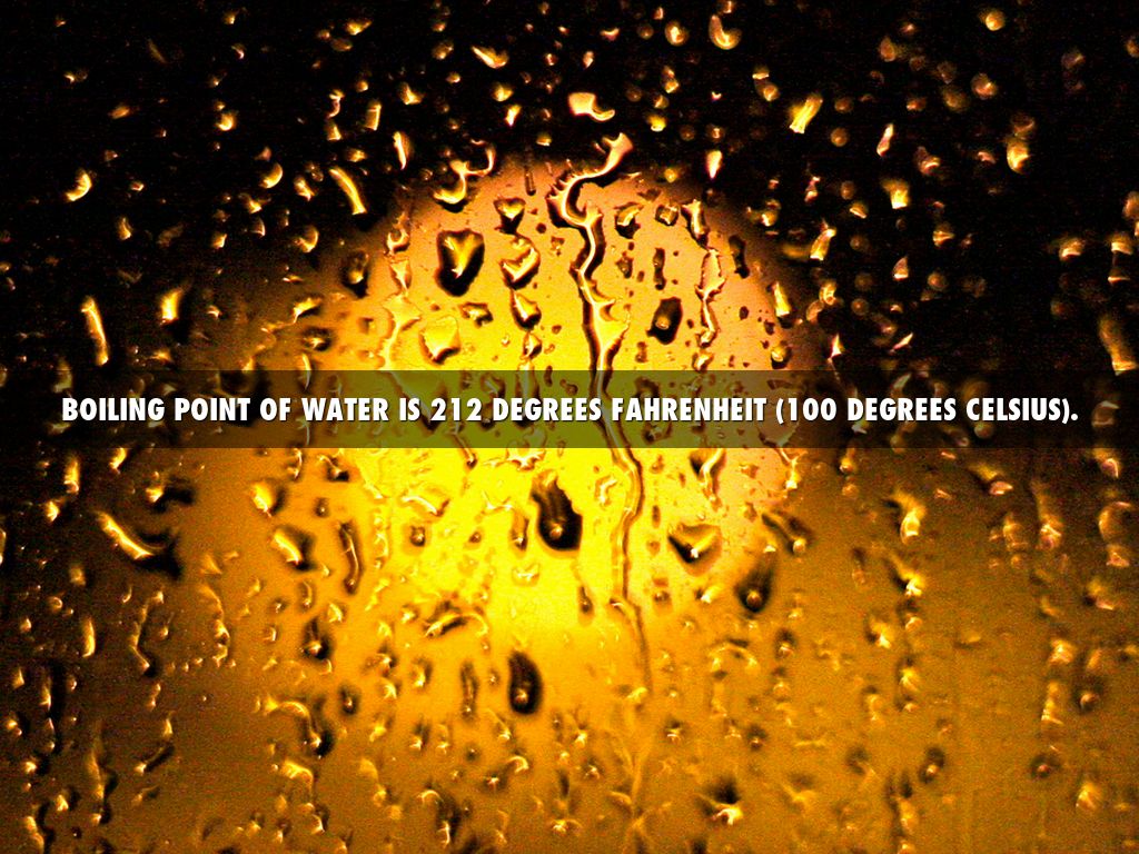 BOILING POINT OF WATER IS 212 DEGREES FAHRENHEIT (100 DEGREES CELSIUS).