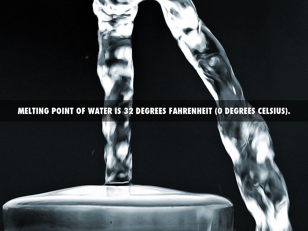 MELTING POINT OF WATER IS 32 DEGREES FAHRENHEIT (0 DEGREES CELSIUS).