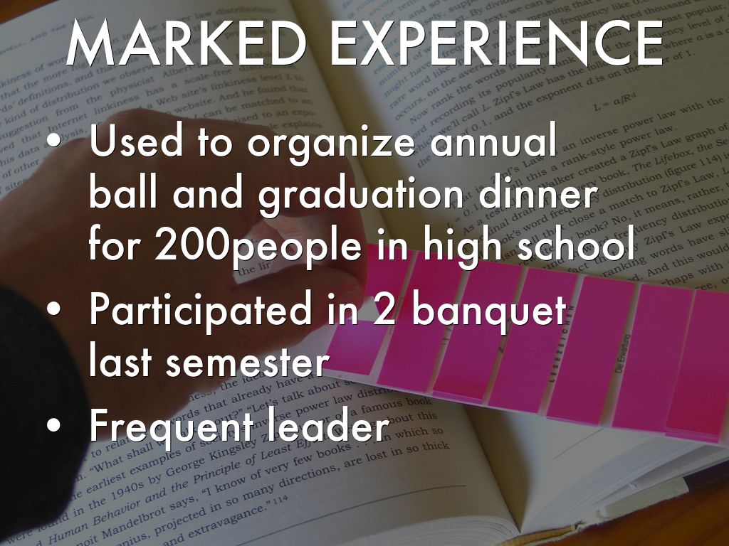 • Used to organize annual ball and graduation dinner for 200people in high school