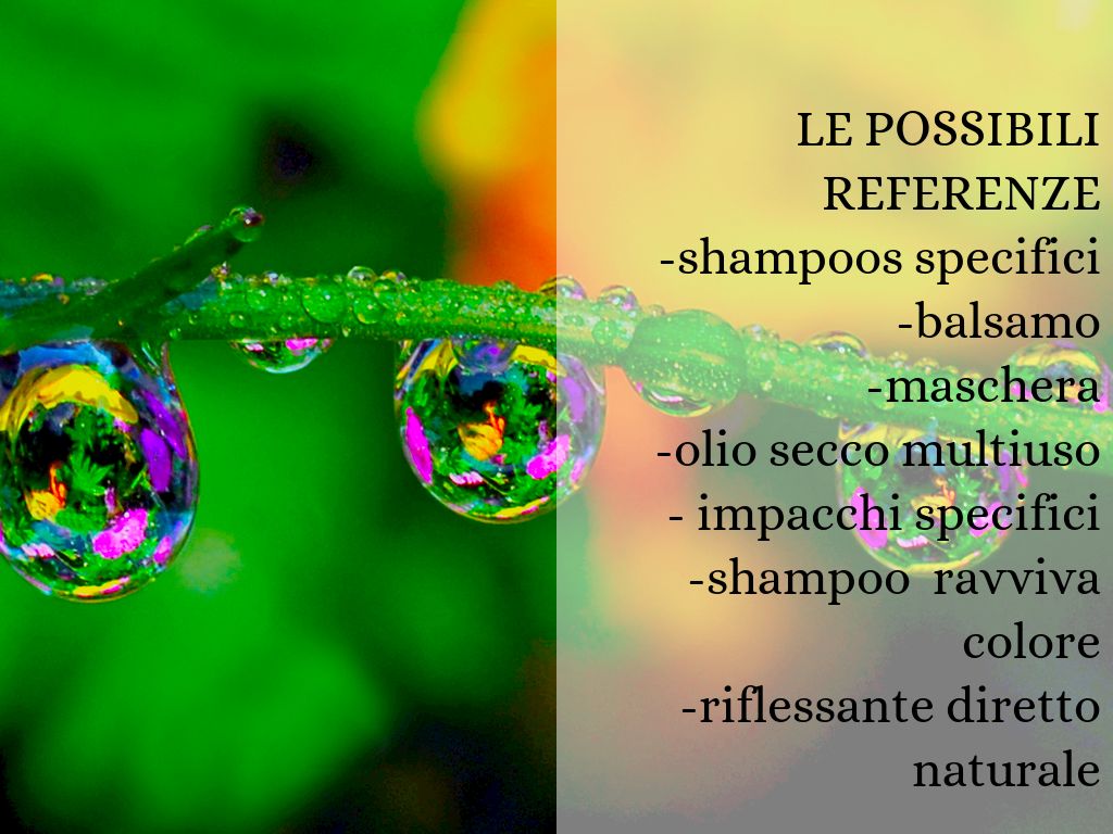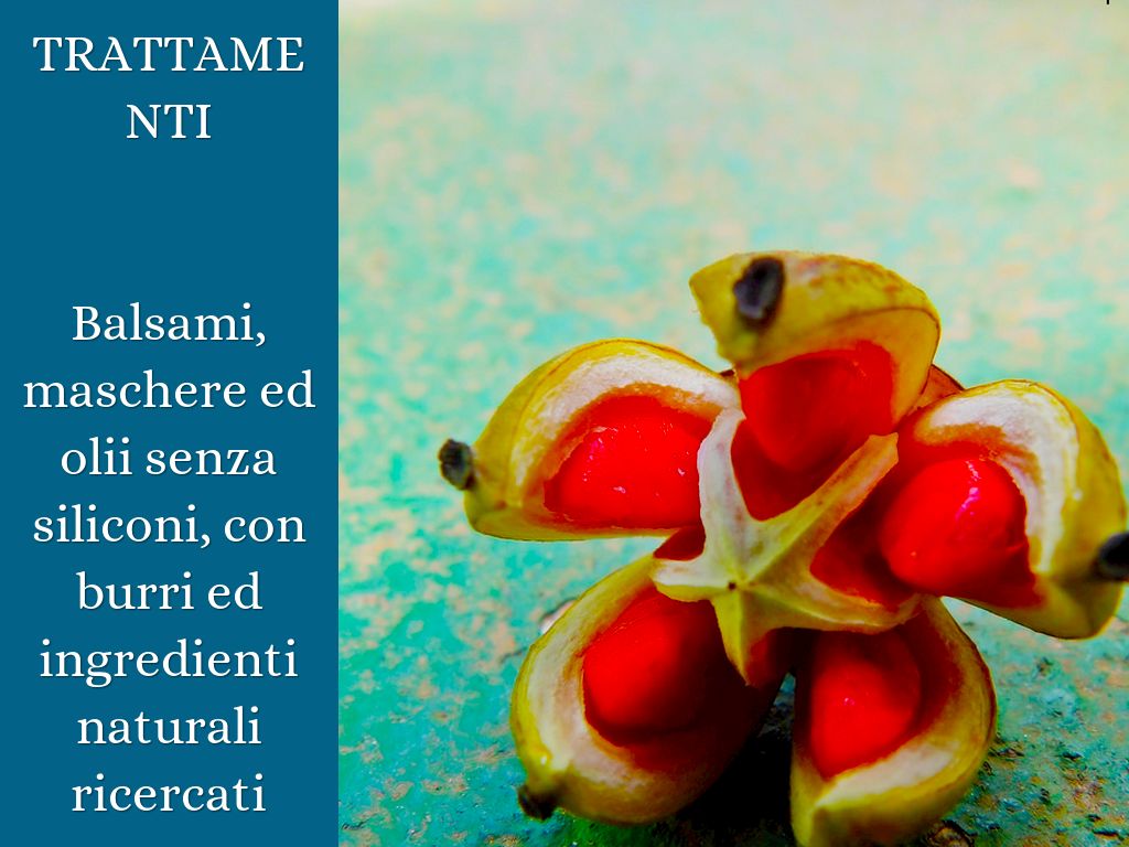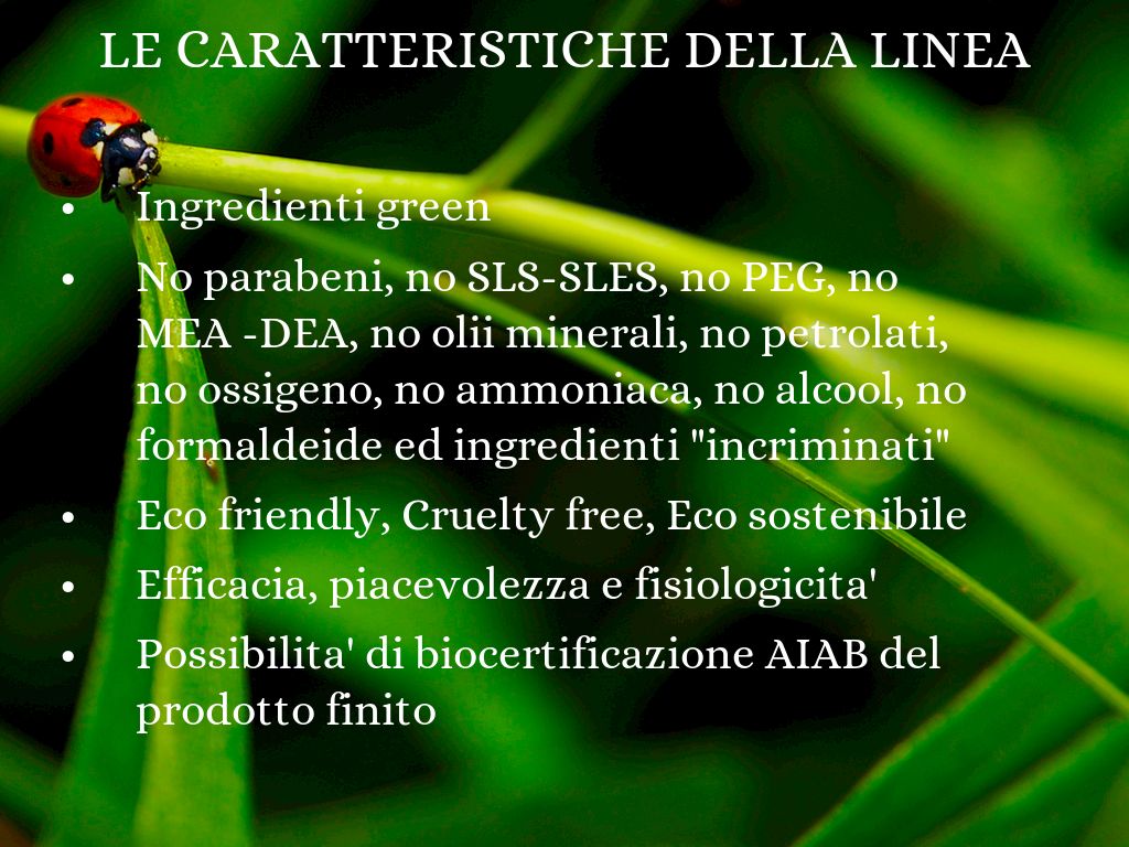 No parabeni, no SLS-SLES, no PEG, no MEA -DEA, no olii minerali, no petrolati, no ossigeno, no ammoniaca, no alcool, no formaldeide ed ingredienti "incriminati"