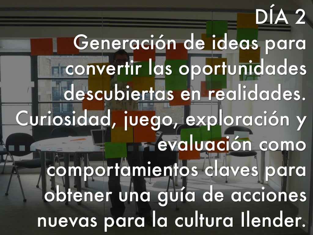 DÍA 2 Generación de ideas para convertir las oportunidades descubiertas en realidades. Curiosidad, juego, exploración y evaluación como comportamientos claves para obtener una guía de acciones nuevas para la cultura Ilender.