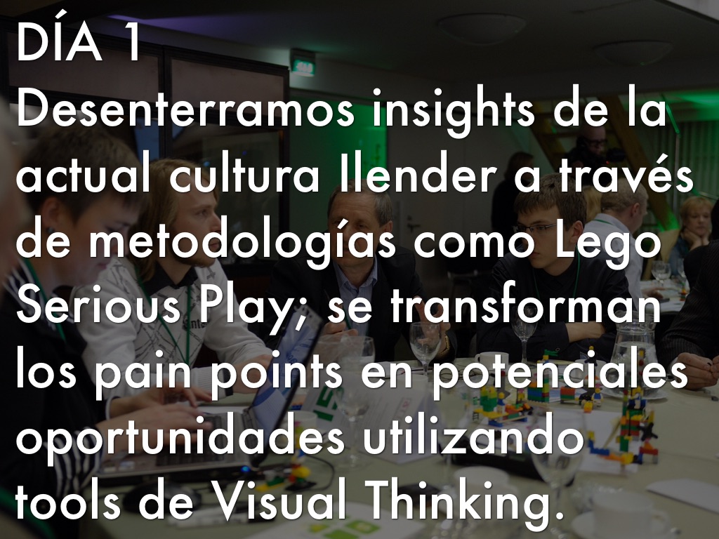 DÍA 1 Desenterramos insights de la actual cultura Ilender a través de metodologías como Lego Serious Play; se transforman los pain points en potenciales oportunidades utilizando tools de Visual Thinking.
