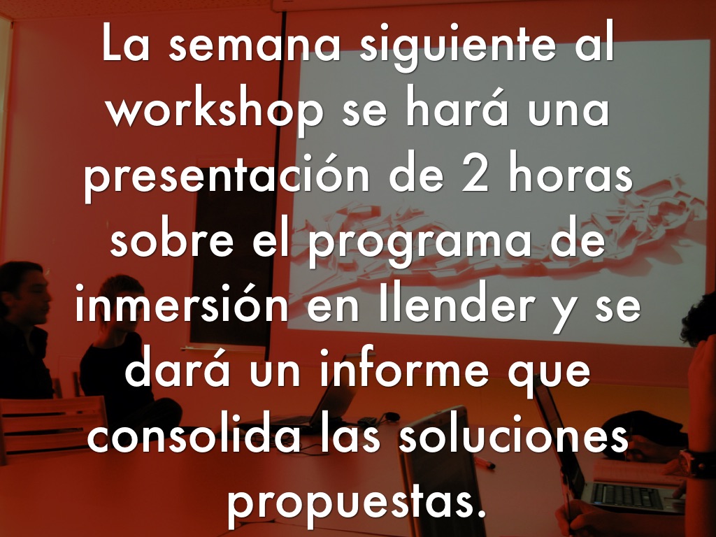 La semana siguiente al workshop se hará una presentación de 2 horas sobre el programa de inmersión en Ilender y se dará un informe que consolida las soluciones propuestas.