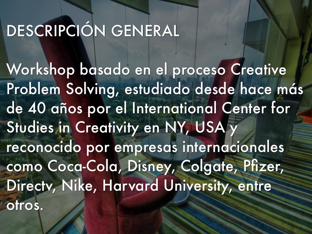 Workshop basado en el proceso Creative Problem Solving, estudiado desde hace más de 40 años por el International Center for Studies in Creativity en NY, USA y reconocido por empresas internacionales como Coca-Cola, Disney, Colgate, Pfizer, Directv, Nike, Harvard University, entre otros.