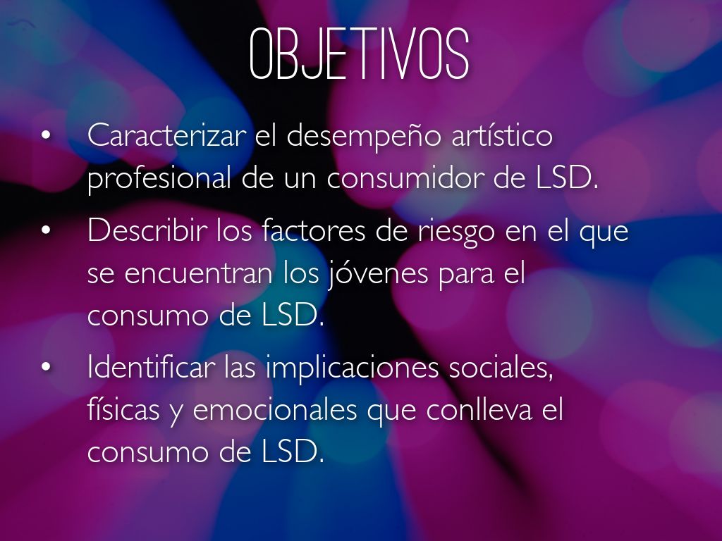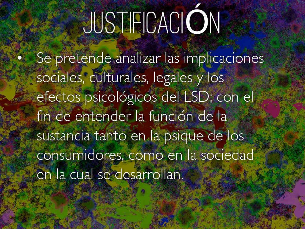 Se pretende analizar las implicaciones sociales, culturales, legales y los efectos psicológicos del LSD; con el fin de entender la función de la sustancia tanto en la psique de los consumidores, como en la sociedad en la cual se desarrollan.