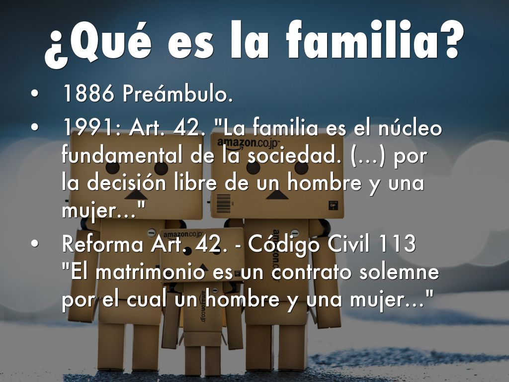 1991: Art. 42. "La familia es el núcleo fundamental de la sociedad. (...) por la decisión libre de un hombre y una mujer..."