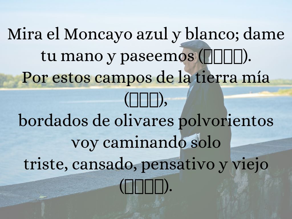 Mira el Moncayo azul y blanco; dame tu mano y paseemos (🌳👋🏼🌳). Por estos campos de la tierra mía (🇪🇸🏡), bordados de olivares polvorientos voy caminando solo triste, cansado, pensativo y viejo (❓👴🏼❓).