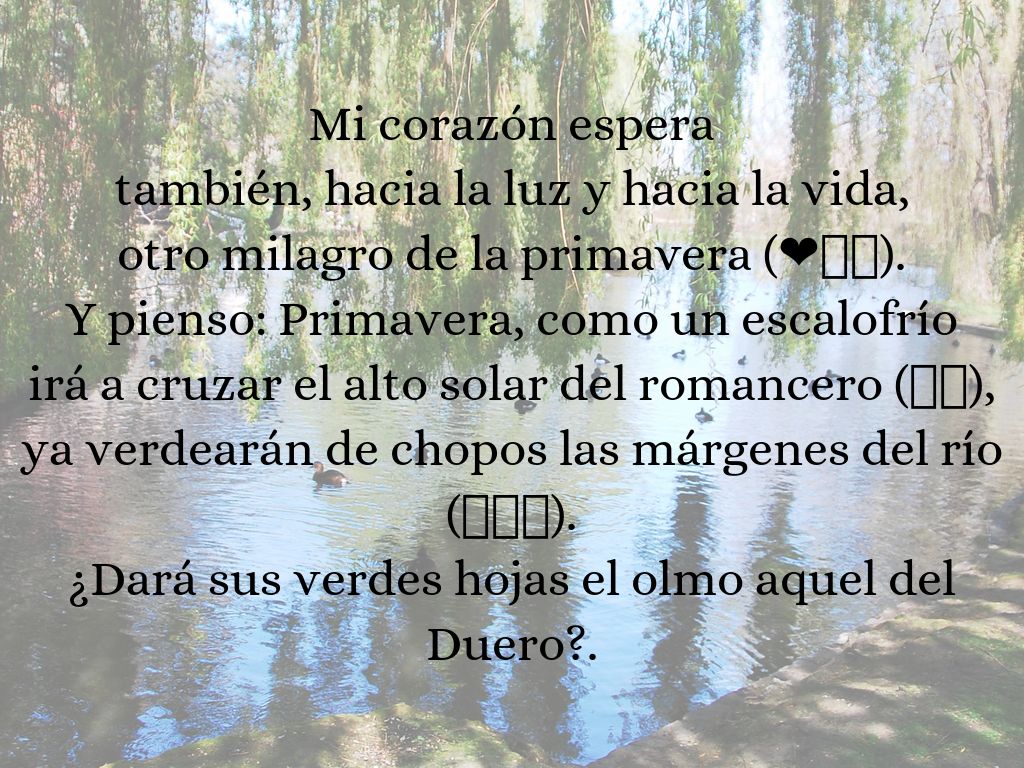 En la desesperanza y en la melancolía de tu recuerdo (😞😓). Tierra del alma, toda, hacia la tierra mía, por los floridos valles, mi corazón te lleva (❤️🌄🇪🇸). En la estepa del alto Duero, Primavera tarda (🌸🕙❓), ¡pero es tan bella y dulce cuando llega!... ¿Tienen los viejos olmos (🌳) algunas hojas nuevas (🌱🌿🍃)?