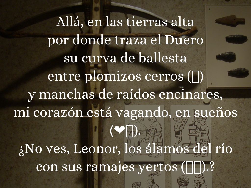 Allá, en las tierras alta por donde traza el Duero su curva de ballesta entre plomizos cerros (🗻) y manchas de raídos encinares, mi corazón está vagando, en sueños (❤️💭). ¿No ves, Leonor, los álamos del río con sus ramajes yertos (🌳🌲).?