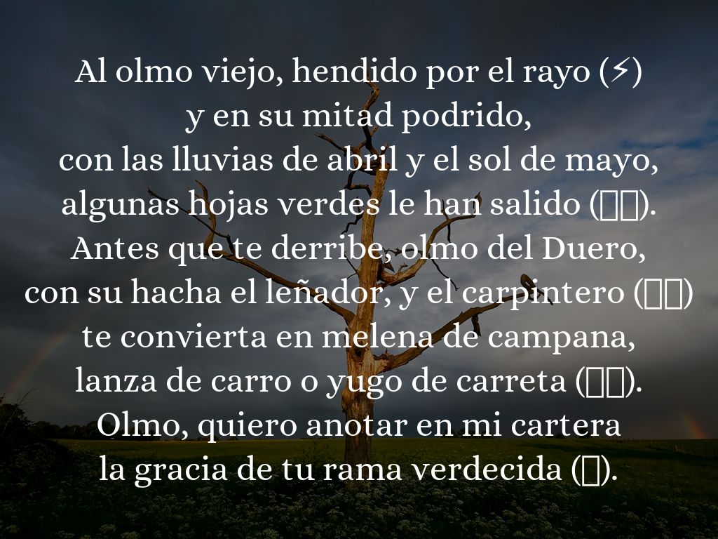 Al olmo viejo, hendido por el rayo (⚡️) y en su mitad podrido, con las lluvias de abril y el sol de mayo, algunas hojas verdes le han salido (🍃🌿). Antes que te derribe, olmo del Duero, con su hacha el leñador, y el carpintero (🌳🔪) te convierta en melena de campana, lanza de carro o yugo de carreta (🚗🚜). Olmo, quiero anotar en mi cartera la gracia de tu rama verdecida (🌿).