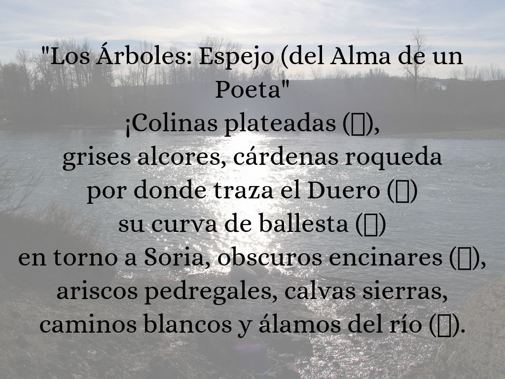 "Los Árboles: Espejo (del Alma de un Poeta" ¡Colinas plateadas (🗻), grises alcores, cárdenas roqueda por donde traza el Duero (🗿) su curva de ballesta (🎯) en torno a Soria, obscuros encinares (🌳), ariscos pedregales, calvas sierras, caminos blancos y álamos del río (🌊).