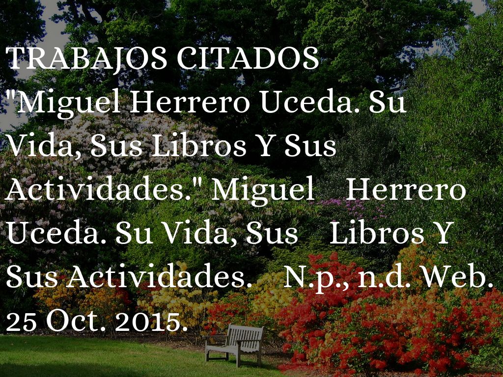 TRABAJOS CITADOS "Miguel Herrero Uceda. Su Vida, Sus Libros Y Sus Actividades." Miguel Herrero Uceda. Su Vida, Sus Libros Y Sus Actividades. N.p., n.d. Web. 25 Oct. 2015.