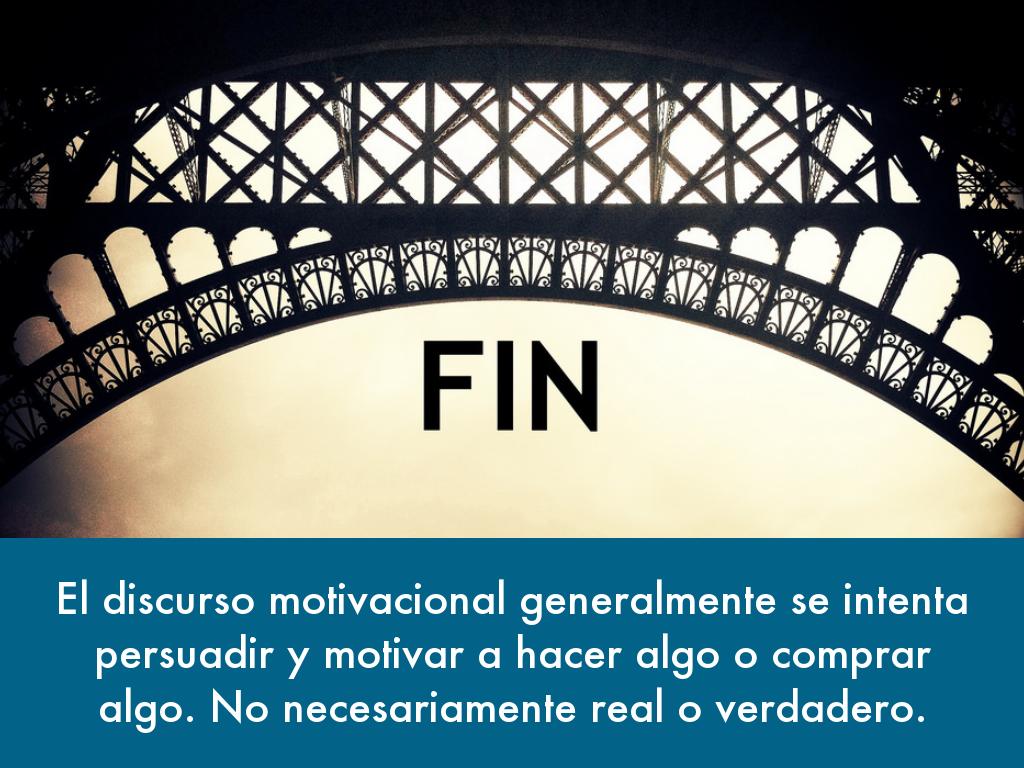 El discurso motivacional generalmente se intenta persuadir y motivar a hacer algo o comprar algo. No necesariamente real o verdadero.