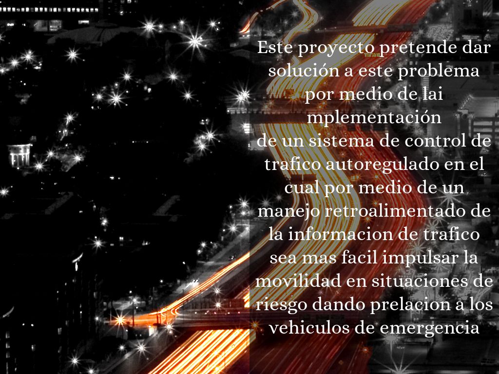 Este proyecto pretende dar solución a este problema por medio de lai mplementación de un sistema de control de trafico autoregulado en el cual por medio de un manejo retroalimentado de la informacion de trafico sea mas facil impulsar la movilidad en situaciones de riesgo dando prelacion a los vehiculos de emergencia