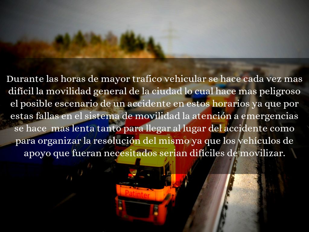 Durante las horas de mayor trafico vehicular se hace cada vez mas difícil la movilidad general de la ciudad lo cual hace mas peligroso el posible escenario de un accidente en estos horarios ya que por estas fallas en el sistema de movilidad la atención a emergencias se hace mas lenta tanto para llegar al lugar del accidente como para organizar la resolución del mismo ya que los vehículos de apoyo que fueran necesitados serian difíciles de movilizar.