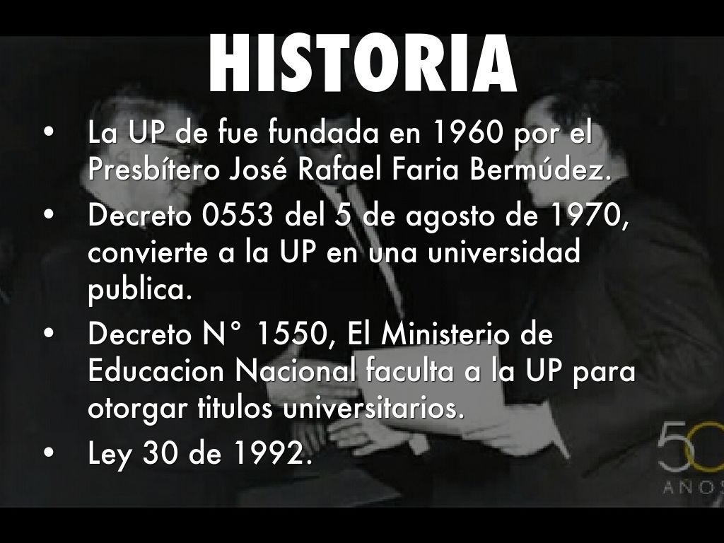 • Decreto N° 1550, El Ministerio de Educacion Nacional faculta a la UP para otorgar titulos universitarios.