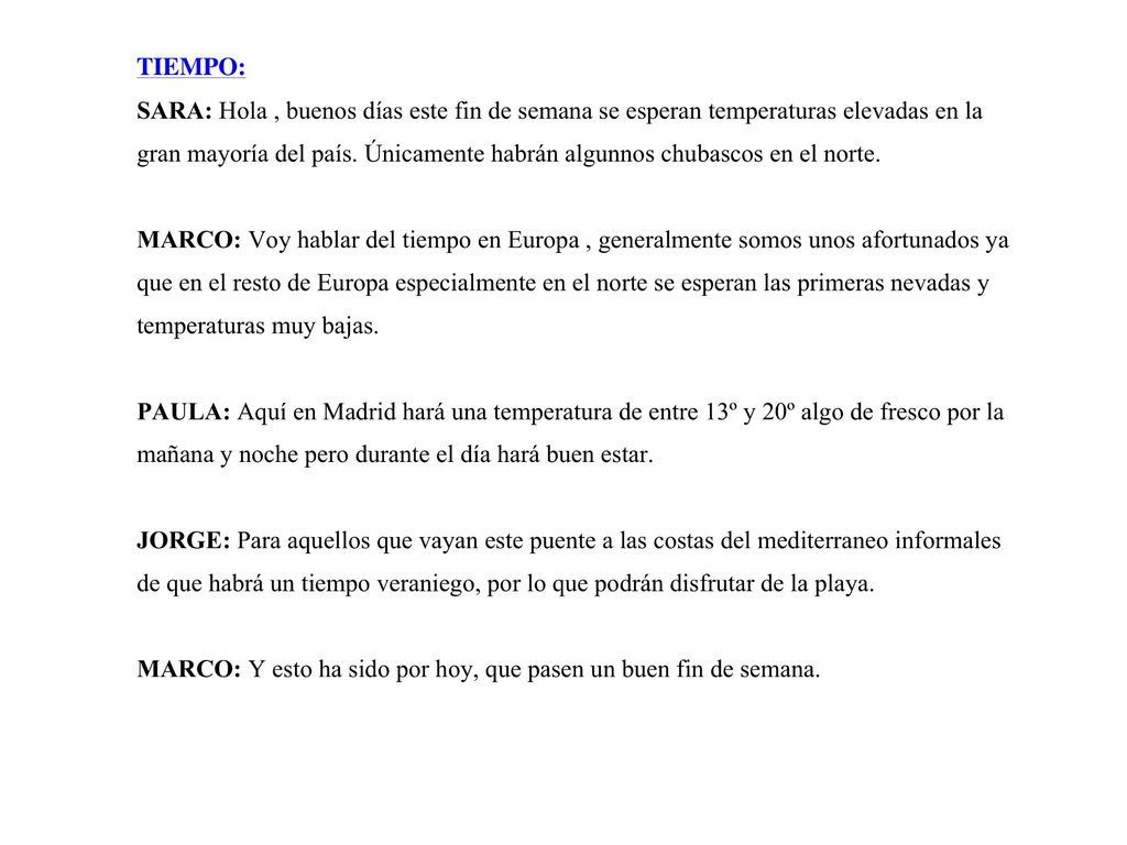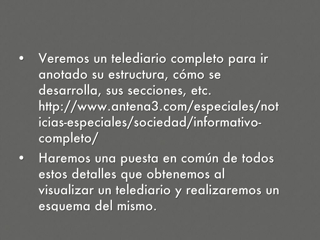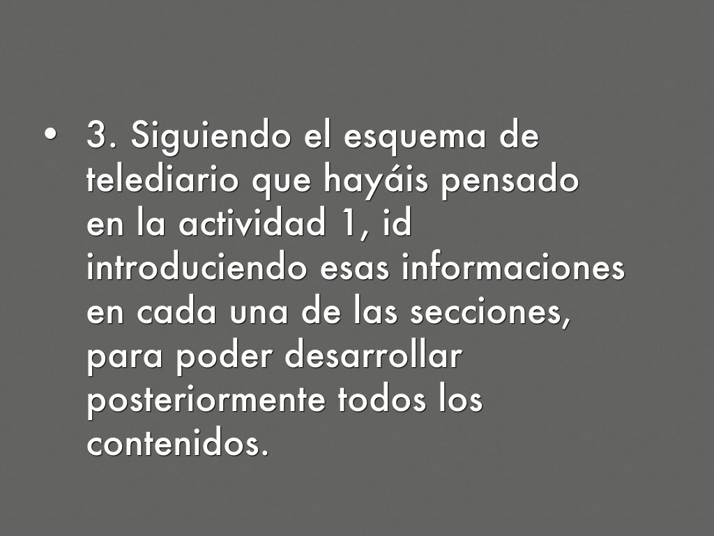 3. Siguiendo el esquema de telediario que hayáis pensado en la actividad 1, id introduciendo esas informaciones en cada una de las secciones, para poder desarrollar posteriormente todos los contenidos.