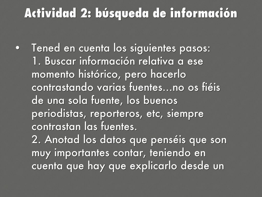 1. Buscar información relativa a ese momento histórico, pero hacerlo contrastando varias fuentes...no os fiéis de una sola fuente, los buenos periodistas, reporteros, etc, siempre contrastan las fuentes.