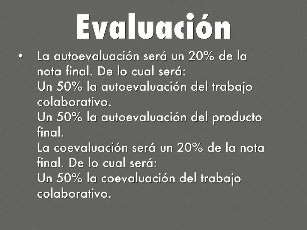 La autoevaluación será un 20% de la nota final. De lo cual será: