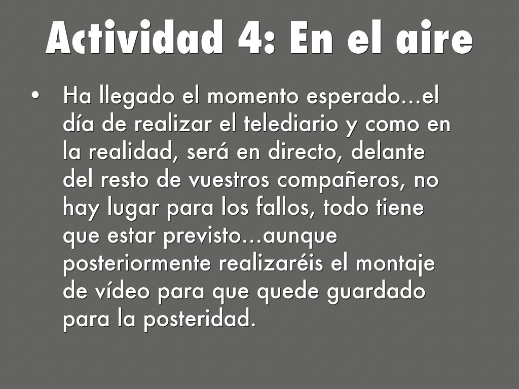 Ha llegado el momento esperado...el día de realizar el telediario y como en la realidad, será en directo, delante del resto de vuestros compañeros, no hay lugar para los fallos, todo tiene que estar previsto...aunque posteriormente realizaréis el montaje de vídeo para que quede guardado para la posteridad.