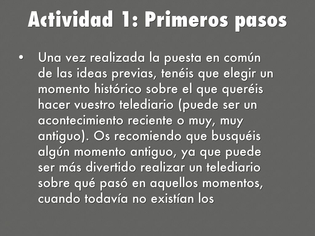 Una vez realizada la puesta en común de las ideas previas, tenéis que elegir un momento histórico sobre el que queréis hacer vuestro telediario (puede ser un acontecimiento reciente o muy, muy antiguo). Os recomiendo que busquéis algún momento antiguo, ya que puede ser más divertido realizar un telediario sobre qué pasó en aquellos momentos, cuando todavía no existían los telediarios.