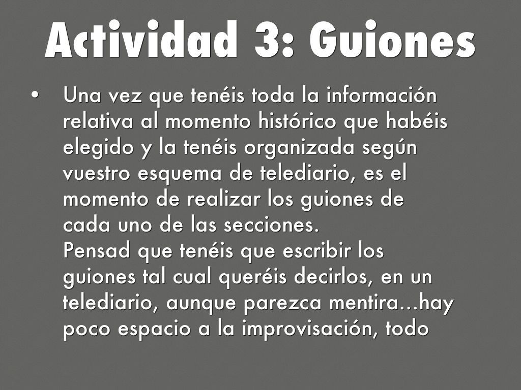 Una vez que tenéis toda la información relativa al momento histórico que habéis elegido y la tenéis organizada según vuestro esquema de telediario, es el momento de realizar los guiones de cada uno de las secciones.